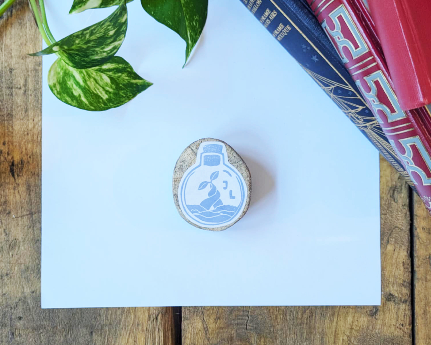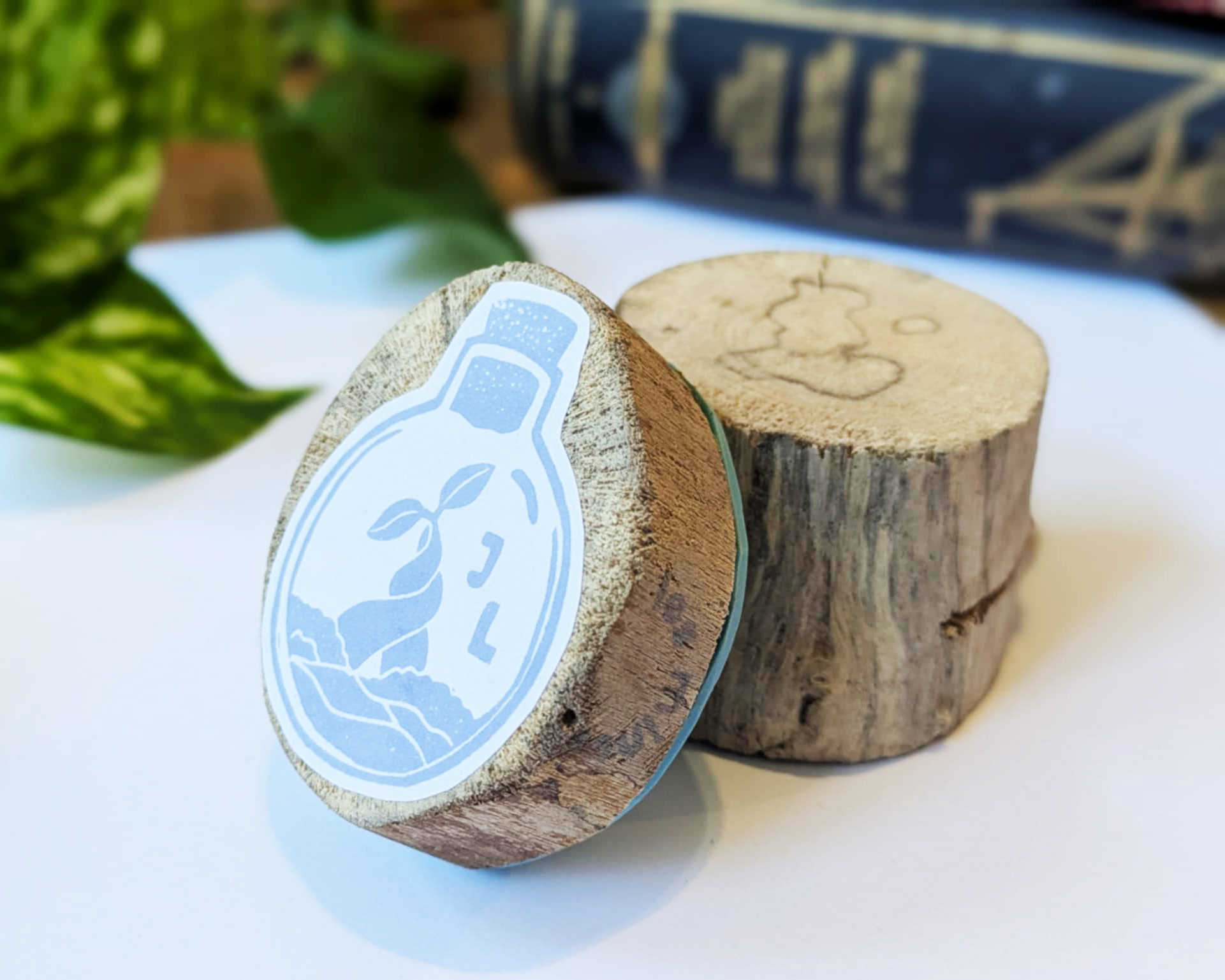 Chaque tampon est gravé à la main à l’aide de gouges traditionnelles. De légères variations par rapport aux photos sont normales et font le charme du travail manuel. Le bois flotté est collecté, découpé et poncé artisanalement, garantissant que chaque support est unique.