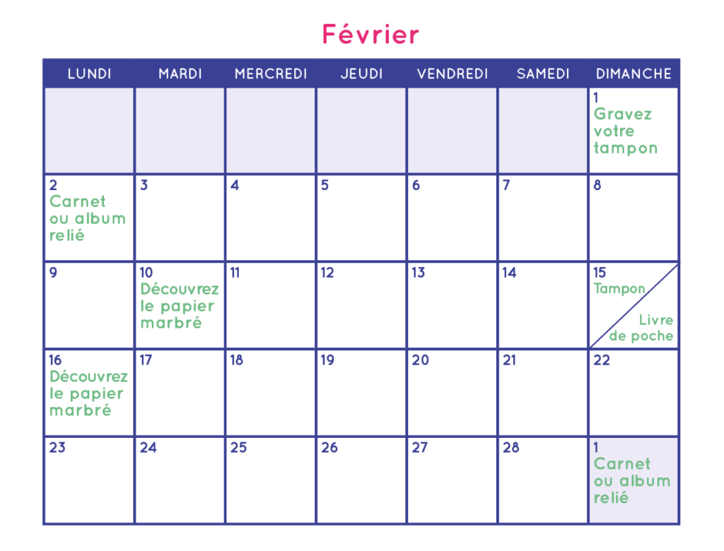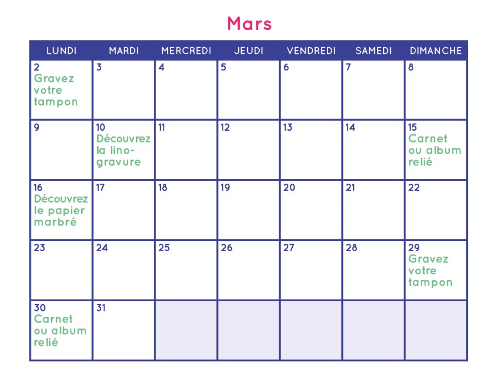 Tout au long de l’année, retrouvez mes ateliers créatifs autour de la papeterie et de la gravure ! Gravure de tampon, initiation à la linogravure, carnet ou album relié, découverte du papier marbré… de quoi combler toutes les âmes créatives et amoureuses de papeterie.